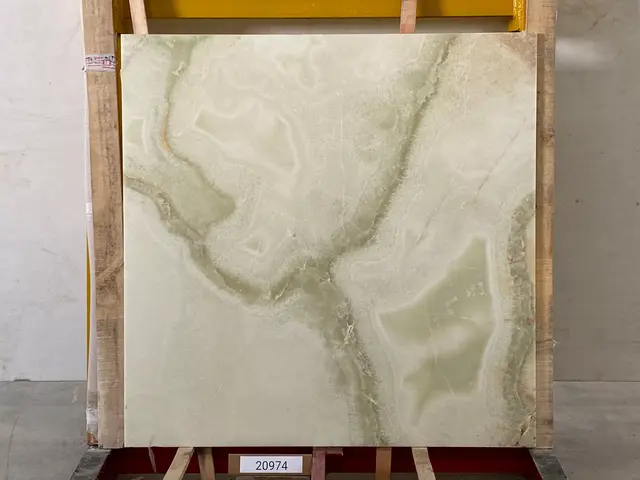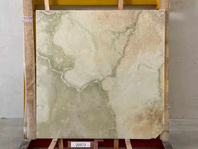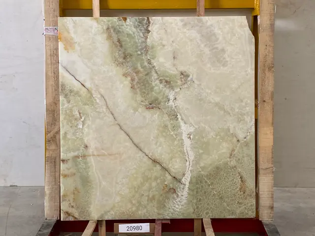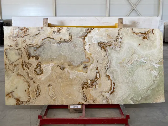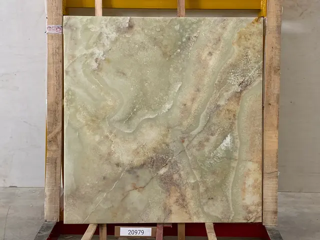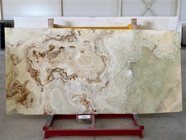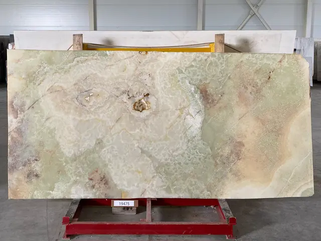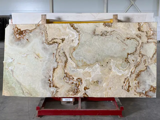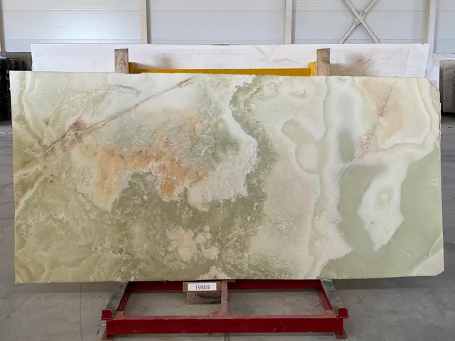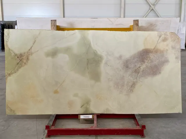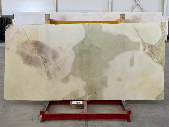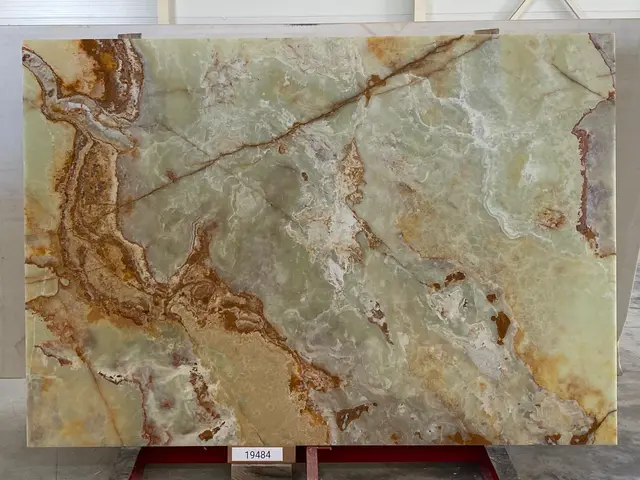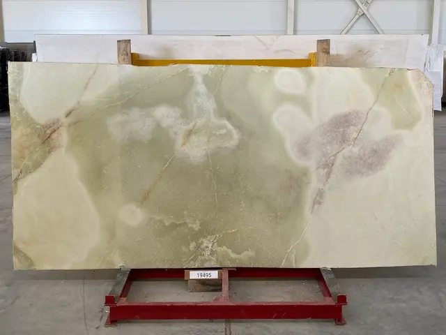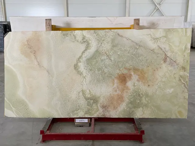 Оникс Onice Light Green светло-зелёного цвета с белыми и золотистыми прожилками. Полированная обработка лучше всего подчёркивает живописный рисунок и нежный оттенок минерала. Полупрозрачная структура камня особенно хорошо раскрывается в сочетании с подсветкой. Добывают этот натуральный минерал в Турции.